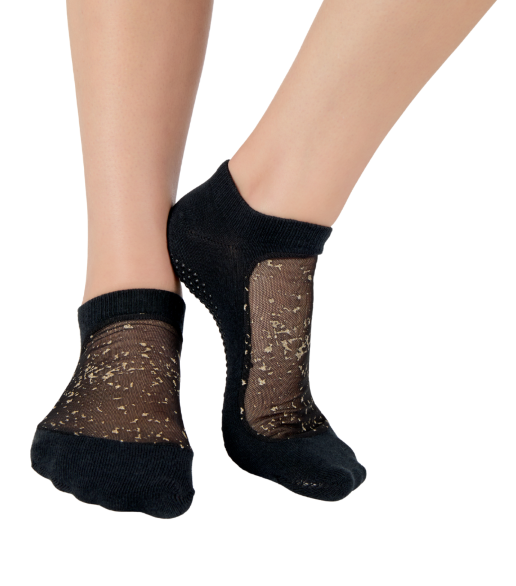Elevate your studio essentials with the SHASHI Sparkle Gold Dust Grip Socks. Designed with a sheer mesh upper delicately finished with subtle gold dust detailing, this refined style blends elegance with performance. Perfect for Pilates, Pilates reformer, yoga, and barre, these non-slip grip socks provide secure full-sole traction to keep you stable and confident through every movement. Lightweight and breathable, Sparkle Gold Dust adds a touch of understated glamour to your studio look while maintaining all-day comfort.