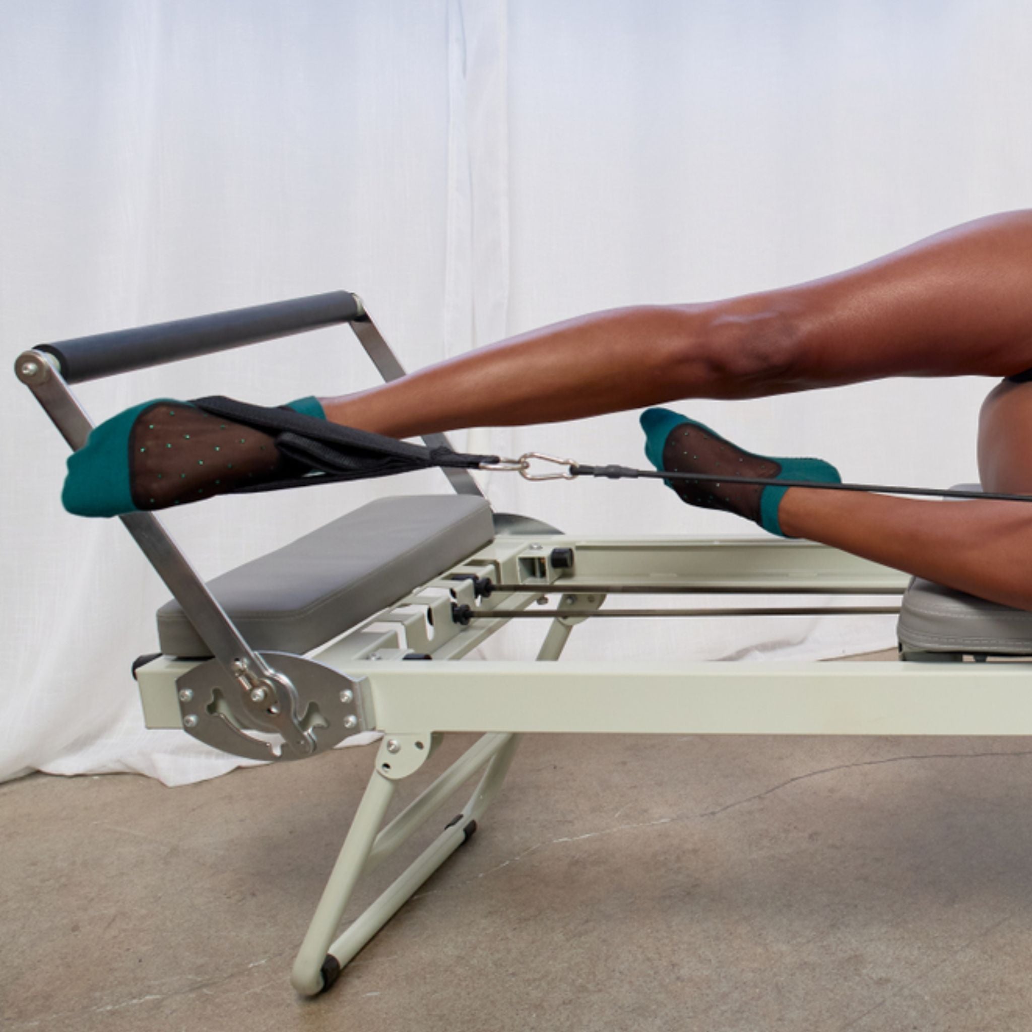 Person performing a Pilates reformer exercise, wearing sheer black grip socks with green dots and a turquoise cuff, foot secured in a resistance strap.